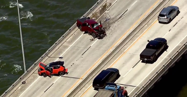 Tampa police said at about 1:52 p.m., a sedan, pickup truck, and motorcycle crashed into each other in the eastbound lanes just before the bridge’s incline.