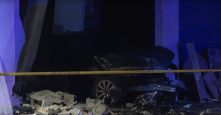 The crash damaged one of the pillars on the side of the building and the vehicle sustained heavy damage.